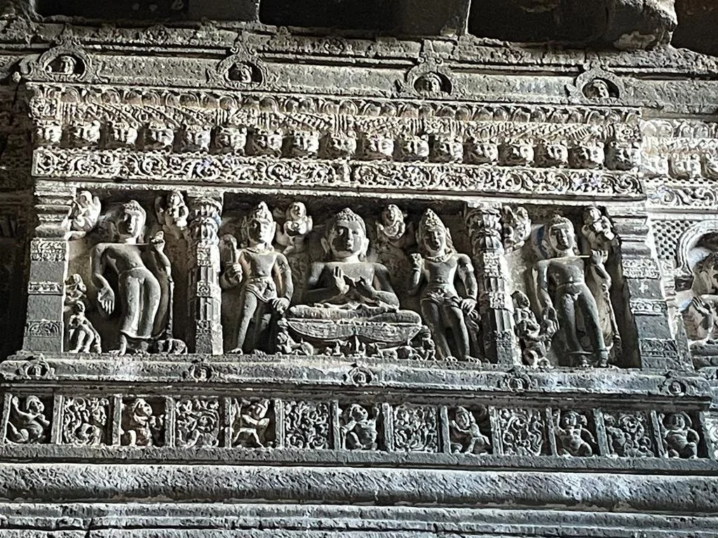 A majestic sight greeted us in the form of 30 rock-cut Buddhist cave monuments dating from the 2nd Century BC literally hewn out of a 75 metre wall of basalt rock, which was surrounded by a jungle full of tigers. They are unbelievable! They were built in two phases, the first starting around the 2nd Century BC and the second around 400 to 650 AD. They constitute ancient monasteries known as Chaityas and have tiny cells with two rock ledges for beds, and worship halls known as Viharas, all with rock-cut sculptures of Buddhist deities done just with chisels and hammers – imagine that!