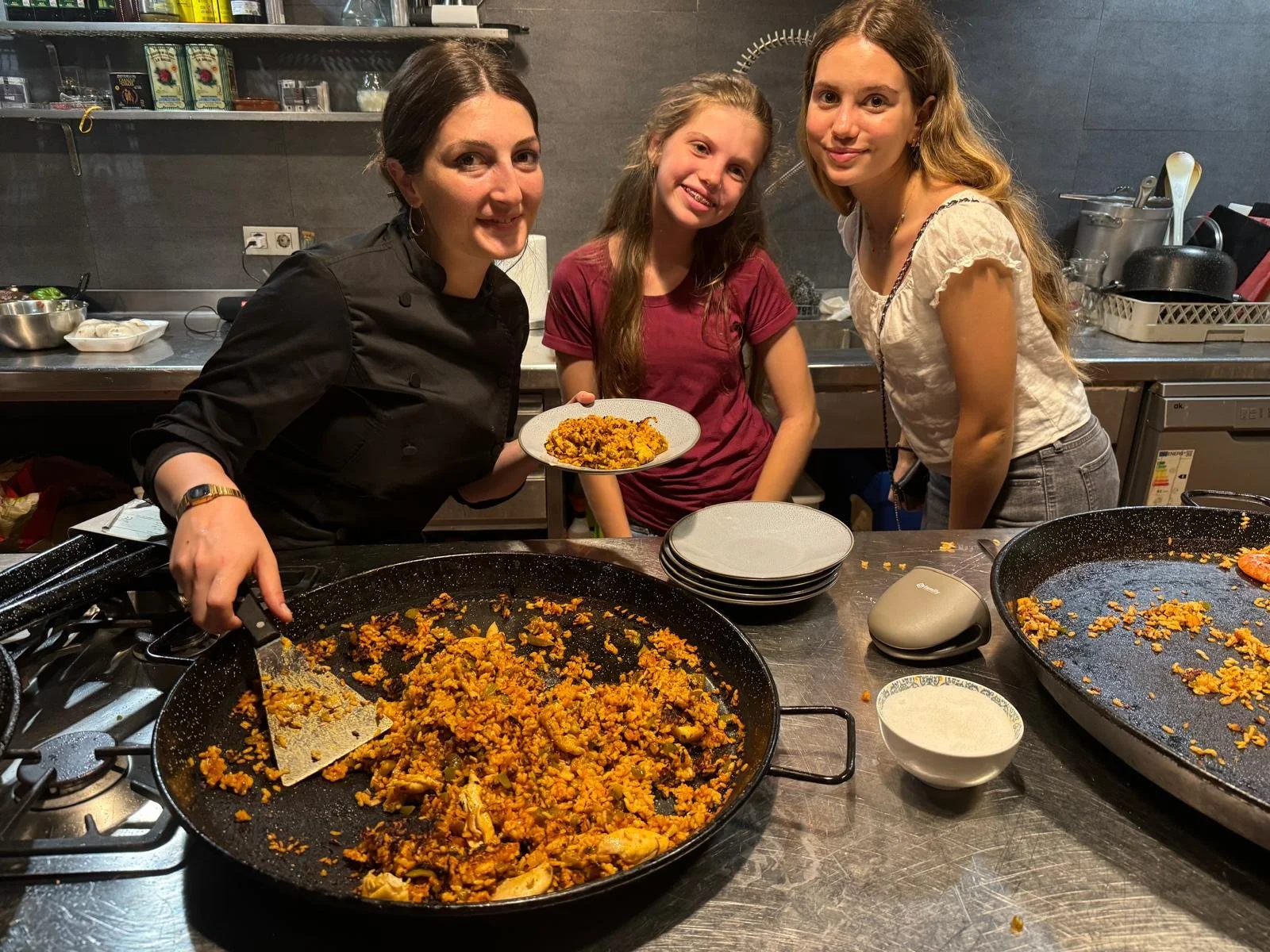 We duly met up with our fellow budding chefs and were taken first to the fish stall where our host for the night, Sally, talked about the various fish ingredients that she was buying from Senora Carmen’s stall to include in the paella lesson. Then off we went, following her through the busy streets until we arrived at her cooking school. What followed next was a lesson on how to make a traditional seafood paella, and a chicken paella for those of us not eating fish. It was quite hands on for the guests and Stella and Chloe were delighted to be able to join in and help mix up the ingredients for the chicken dish. Whilst this was cooking, we enjoyed some meat and cheese tapas and had a lesson on how to make traditional Spanish Sangria which went down well with more than a few of the crowd. After having seen how much wine, rum, vodka and Cointreau was added into the jug and knowing I was sole charge of two teenagers, I decided to give it a miss! We had a really fun, different kind of evening, and thoroughly enjoyed eating the fruits of our labours before heading back to the hotel.
