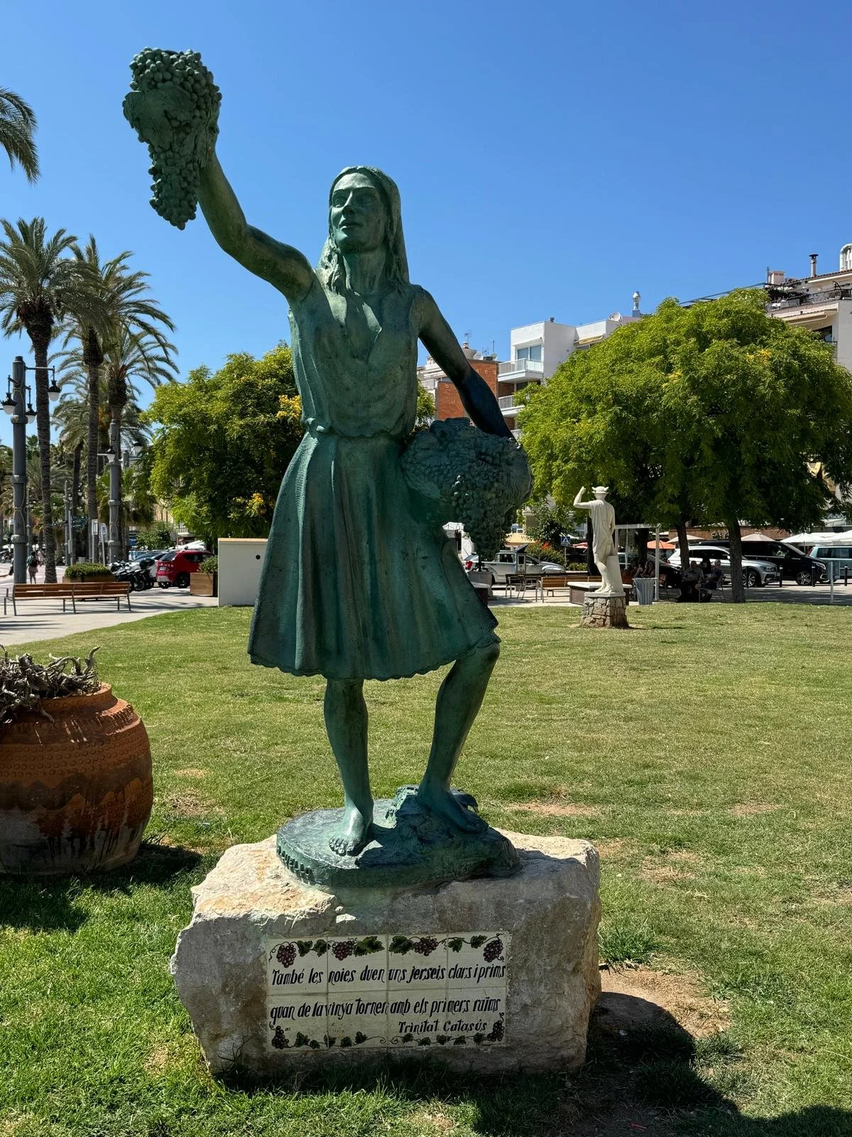 We quickly walked through the main street and down to its beautiful promenade, the Passeig de la Ribera, which stretches 2.5 kilometres from the Church of Sant Barthomeu i Tecla to the Terramar Gardens. It was lovely being by the sea after being in the centre of a city and we loved the fresh sea breezes and openness of the wide promenade. We were starving so found a lovely little restaurant on the seafront where we enjoyed a lunch of chicken Catalan style – the national dish of Catalonia! Then it was time for a promenade walk – so many amazing sculptures to look at – Doménikos Theotokópoulos, known as El Greco, the Greek painter, sculptor and architect of the Spanish Renaissance and a great scenario of two sculptures depicting Santiago Rusiñol and Ramon Casas, two of the great successful bohemian painters of Catalan Modernism of the late 1800’s. Next was the sculptural monument that honours the famous son of the city of Sitges, Facundo Bacardi Masso who settled in Santiago de Cuba and after experimenting with the process of distilling rum, found a satisfactory formula, acquired an old distillery and founded the Bacardi company in 1862. This is an interesting sculpture as it depicts the iconic Bacardi bat logo which came about when Doña Amalia, Don Facundo’s wife, spotted a colony of fruit bats in the rafters of the first Bacardi distillery in Santiago de Cuba, symbolizing good health, family unit and good fortune, she knew the bat was the right choice to symbolize Bacardi! As we walked towards the Church – we saw the sculpture of a woman holding a bunch of grapes representing the grape harvest and finally, just by the steps to the beautiful Church of Sant Bartomeu i Santa Tecla, Pere Jou’s bronze sculpture of the mermaid – La Sirena - which was inspired from Maragall’s poem that talks about the relationship between a mermaid, a shepherd, the sea and the land – and like those two sculpures I talked about in Croatia, her hand is gold from everyone touching it for good luck.