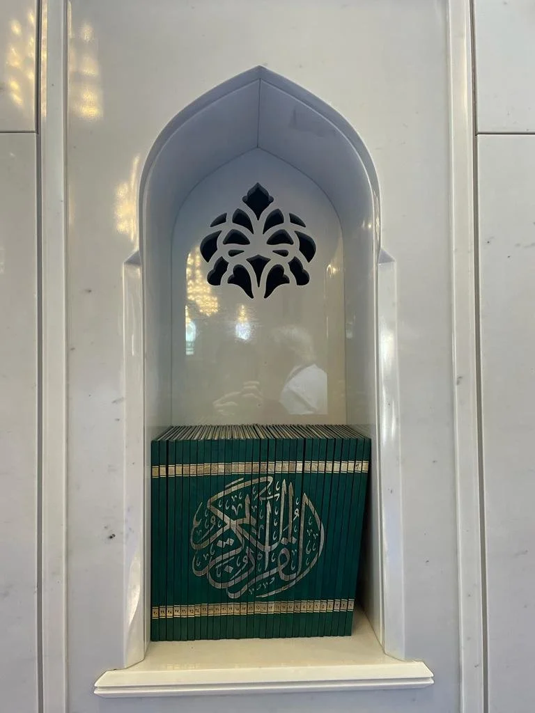 There is a recessed part for the Imam to stand in, which enables better acoustics. When he begins his message it is broadcast throughout the mosque and can be viewed on TV screens in the Women’s Hall. There are two doors within this place, the left hand door leading to the room where the Imam puts on his clothes and gets ready to pray and the right hand door leads to a staircase where he goes on Friday’s to give his messages ie last month a message for the end of Ramadan, and previously messages about Covid etc. We were also able to see the copy of the Koran, their manual for life, which most Muslim’s have on their I-phones along with a compass showing the direction of Mecca. One of the 4 pillars of Islam is that Muslims pray five times each day and before these prayers are expected to perform a purification ritual called Wudu which means washing the hands, mouth, nose, head, arms, back and feet some up to three times each. Our guide demonstrated this to us in the marbled washing area where this takes place. Each mosque has a Muezzin who is chosen for his good character, voice and skills to serve. He is responsible for keeping the mosque clean, rolling the carpets, cleaning the toilets and the washing area, and the calling to prayer, a familiar sound in Muslim countries.