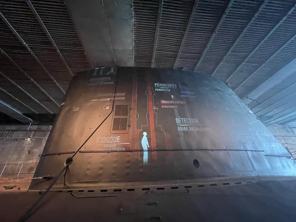 Part of the Chantiers de l’Atlantique has been set aside as an educational base and museum, so we popped in to see what was going on and were very happy to find out we could book a tour of the Submarine L’Espadon (The Swordfish). Armed with English translation headphones we headed into the building and there in the water in front of us in a huge pen, was this 78 metres long, hulking steel submarine. It was built in Le Havre and put into service in 1960. It was able to dive for up to 5 or 6 days (this was before nuclear submarines) and had a top speed of 16 knots on the surface and 18 knots under water. It was in service until 1985 and during this time spent 1,561 days at sea and 33,796 hours diving. It was active during the Cold War but was never involved in military conflict.